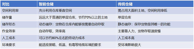 智能仓储与传统仓储相比,从空间利用率、作业效率、人工成本等指标来看,优势显著,降本增效明显。