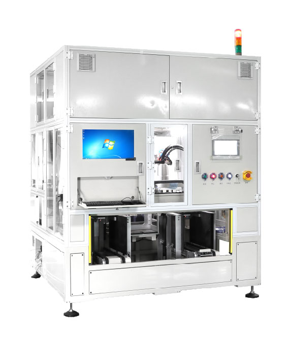 一套成像系统、两套机械手在线检测分析,针对方形聚合物软包电芯或成品电池进行在线全自动检测,将不良品挑选出来,设备前后端可与产线对接。